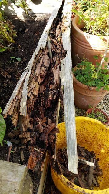 I'm also grumpy because after digging up a bed of potatoes yesterday I found my 10 year old treated sleepers have all had it. They were an expensive way of making raised beds and I expected them to last a bit longer than that. This sleeper was above soil level too so it's not like it was kept constantly damp. I expect the cold winters had a hand in speeding their demise by breaking them apart with the frosts.